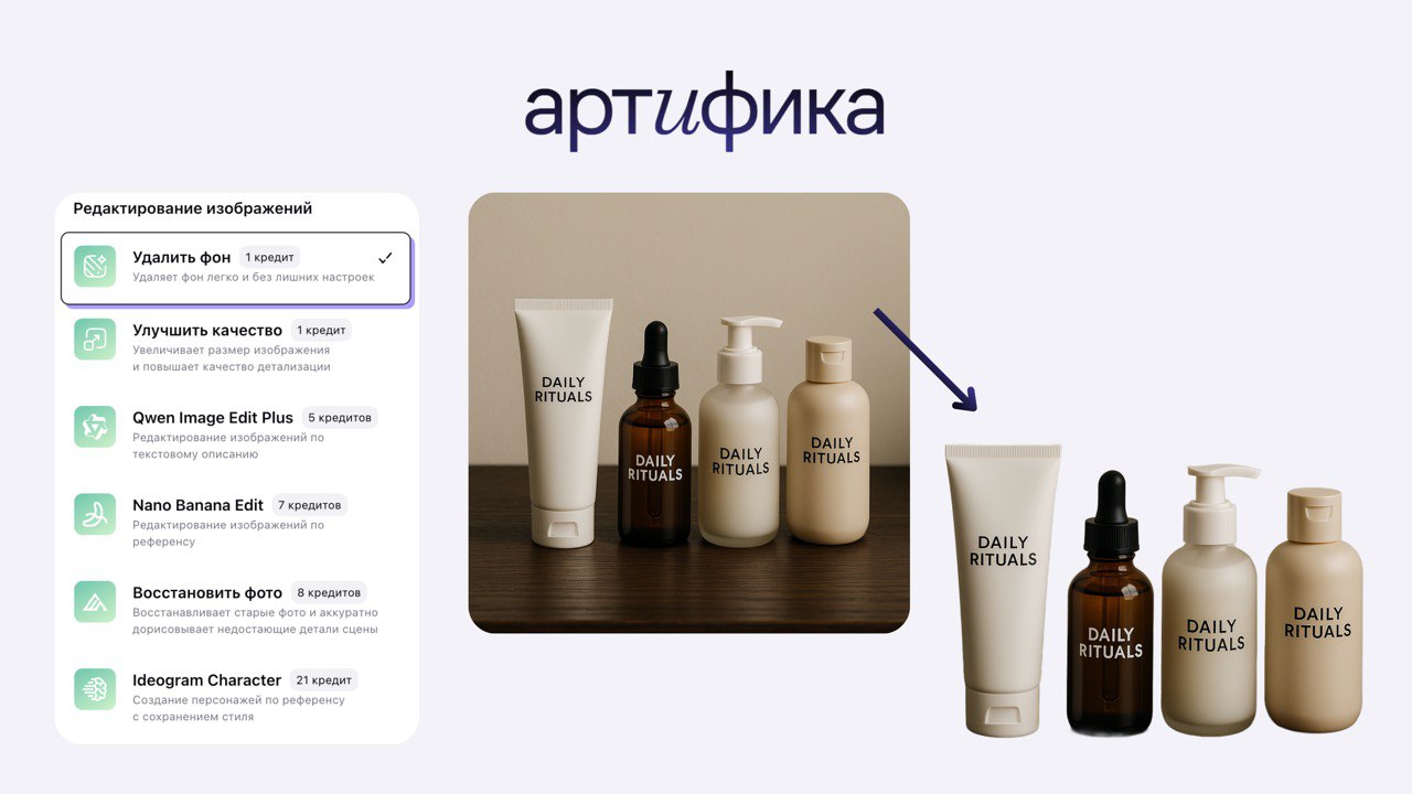 Загрузите любое изображение на нашу платформу и удалите фон в один клик — быстро, легко и бесплатно! Например, у вас есть фото товара, которое нужно разместить на белом фоне для маркетплейса или сайта — загрузите изображение, и Артифика автоматически уберёт фон, сохранив четкость и детали.