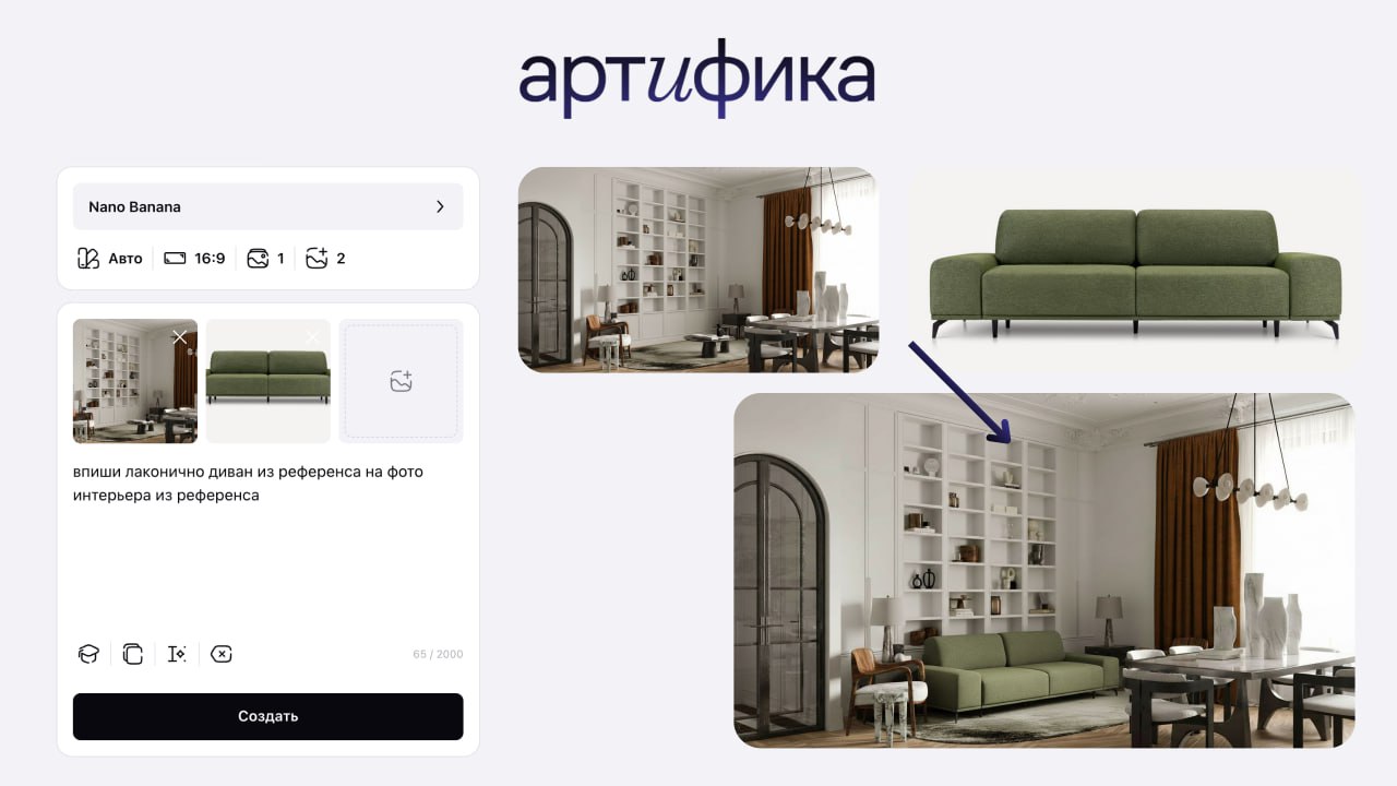 Иногда нужно срочно показать товар в другом контексте — и Артифика поможет вам встроить любой объект в любую сцену, будто он всегда там и был. Например, если у вас есть фотография дивана, изображение которого нужно показать на фоне дизайна новой квартиры, просто загрузите объект и выберите фон — Nano Banana сделает всё за вас.