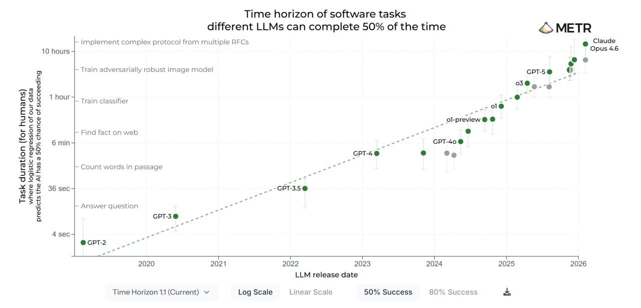 И вот что показывает график: этот горизонт растёт экспоненциально. В 2019 году модели справлялись с задачами на пару минут. Сейчас свежие модели вроде Claude Opus 4.6 и GPT-5.3 уже решают задачи, на которые у человека уходят часы.