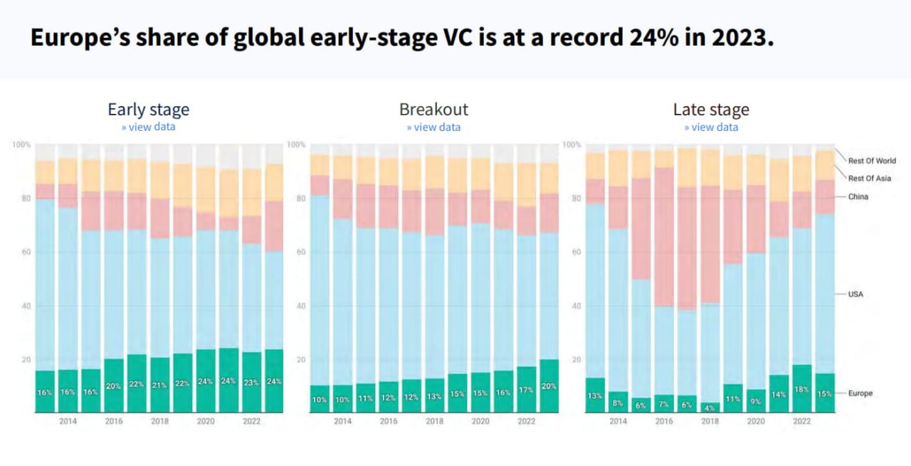 Вот таких два интересных графика можно обнаружить в исследовательском отчете от Dealroom. Они подчеркивают сильный рост интереса к стартапам ранних стадий. Рост год от года в инвестирование ранних стадий составляет 24%, а Европа догнала США по количеству инвестиций в стартапы на ранних стадиях.