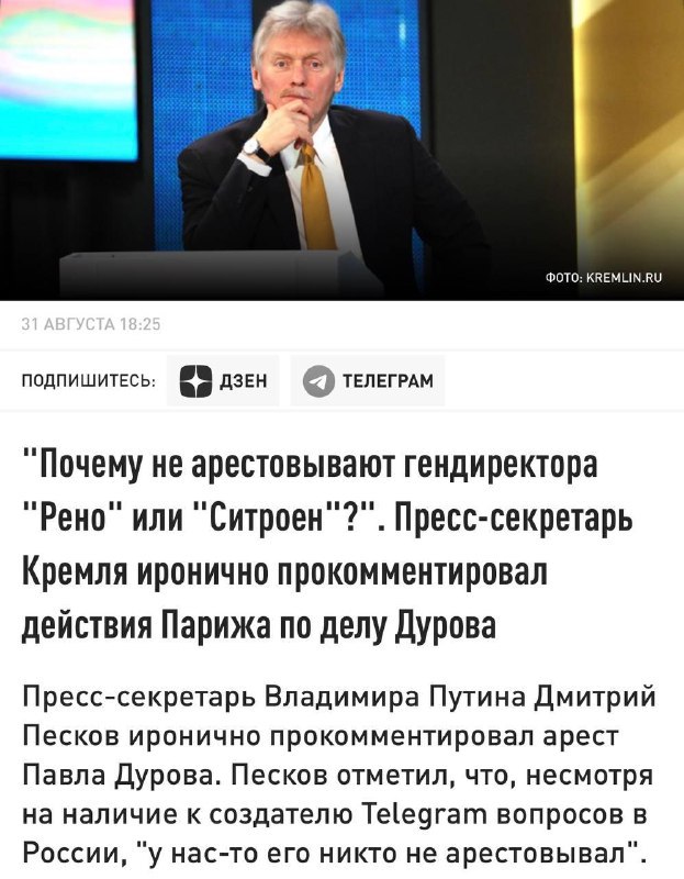 Песков сегодня поддержал дело против Павла Дурова и блокировку Telegram, сославшись на помощь террористам. При этом два года назад, когда Дурова задержали во Франции, Песков говорил, что террористы пользуются Telegram, но пользуются и автомобилями, и задавал сравнение про гендиректоров Renault или Citroen, которых за это не арестовывают.