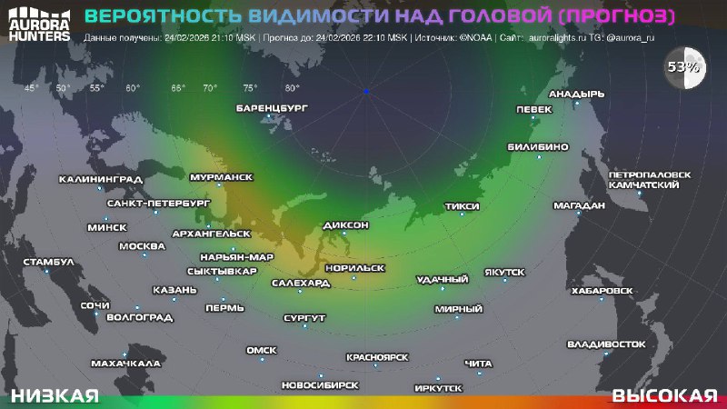 Над Архангельской областью прямо сейчас разгорается северное сияние. Шанс увидеть Аврору составляет 42%. Если небо будет ясным и получится заметить сияние, можно поделиться фотографиями в комментариях.