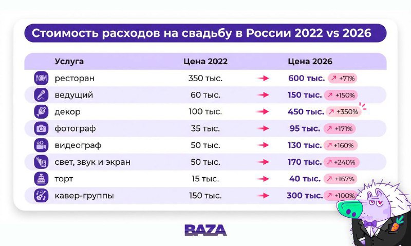 Средний чек за еду дошёл до 8–10 тысяч рублей на человека. Декор за четыре года подорожал на 650%. Чтобы уложиться в деньги, выбирают минималистичные площадки и часто делают многое сами, от рассадки гостей до украшения зала.