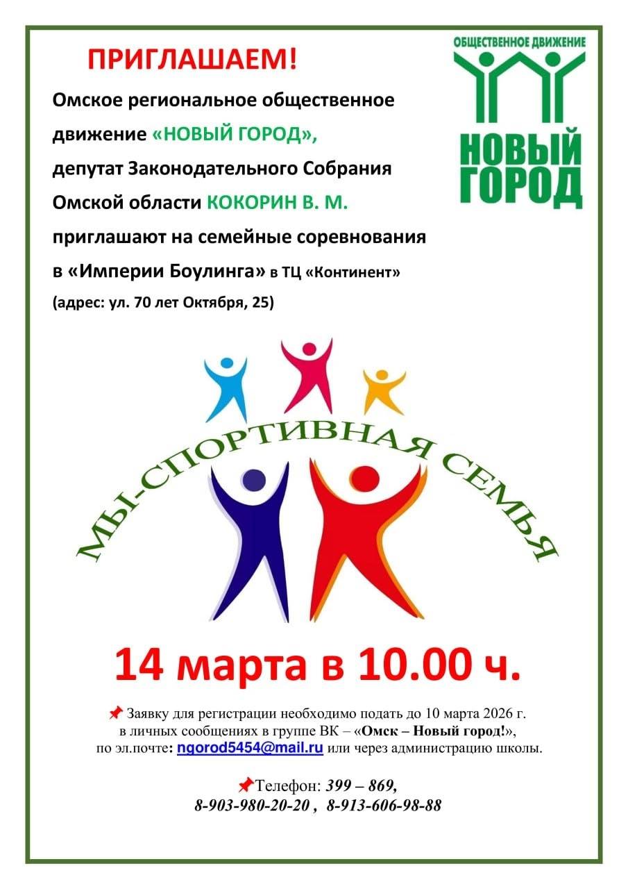 РОД "НОВЫЙ ГОРОД" приглашает семьи принять участие в спортивных соревнованиях "Мы – спортивная семья". Участвуют команды семей с детьми от 8 лет, состав до 6 человек. Требуется регистрация и единый спортивный стиль.