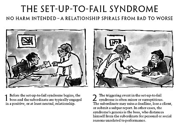 Эксперты по лидерству и организационному развитию Жан-Франсуа Манцони и Жан-Луи Барсукс объяснили в статье для Harvard Business Review опасный феномен управления — "Синдром установки на провал" (The Set-Up-To-Fail Syndrome).