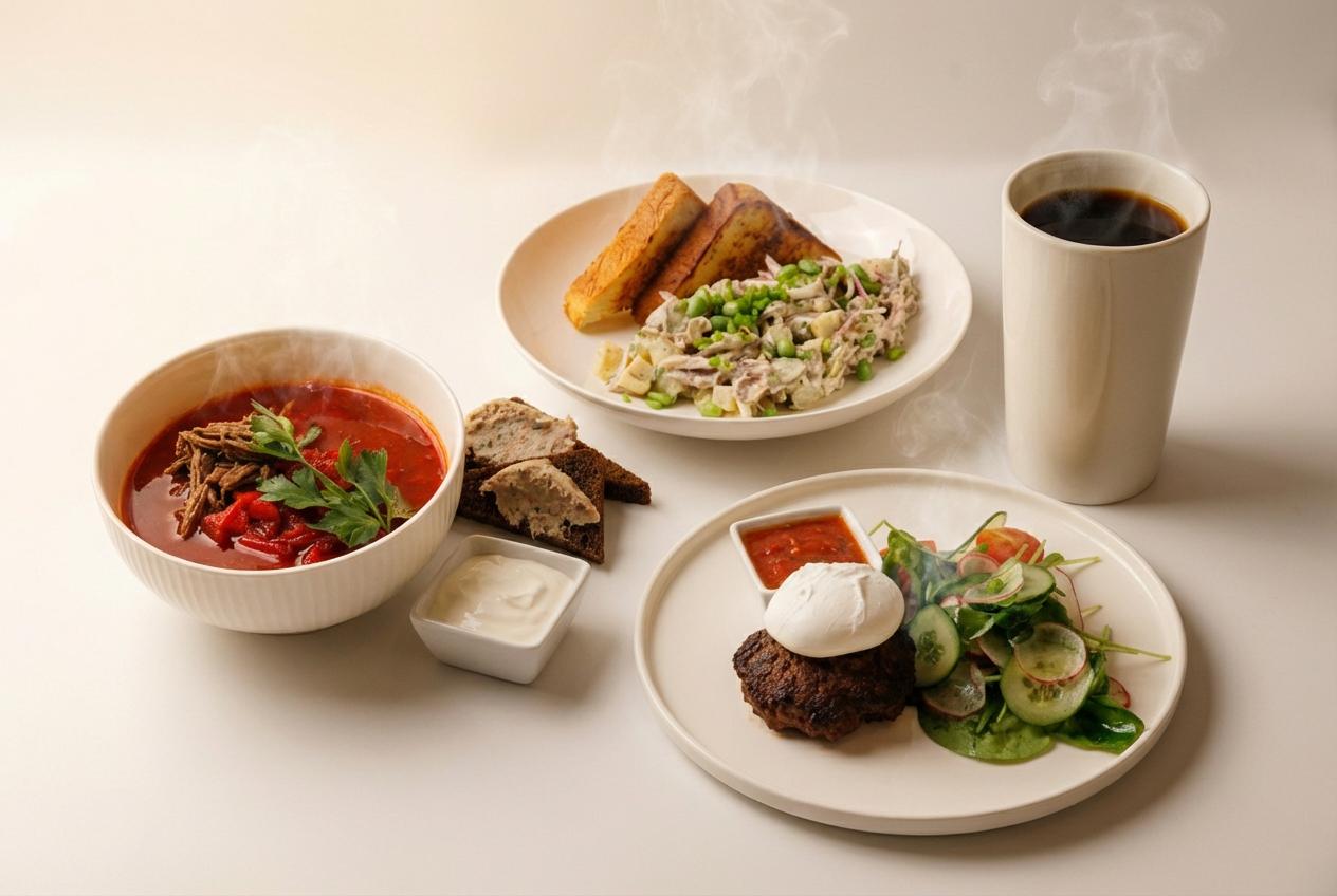 Затем — борщ с говядиной и бородинские гренки с салом — густо, ароматно, по-домашнему.