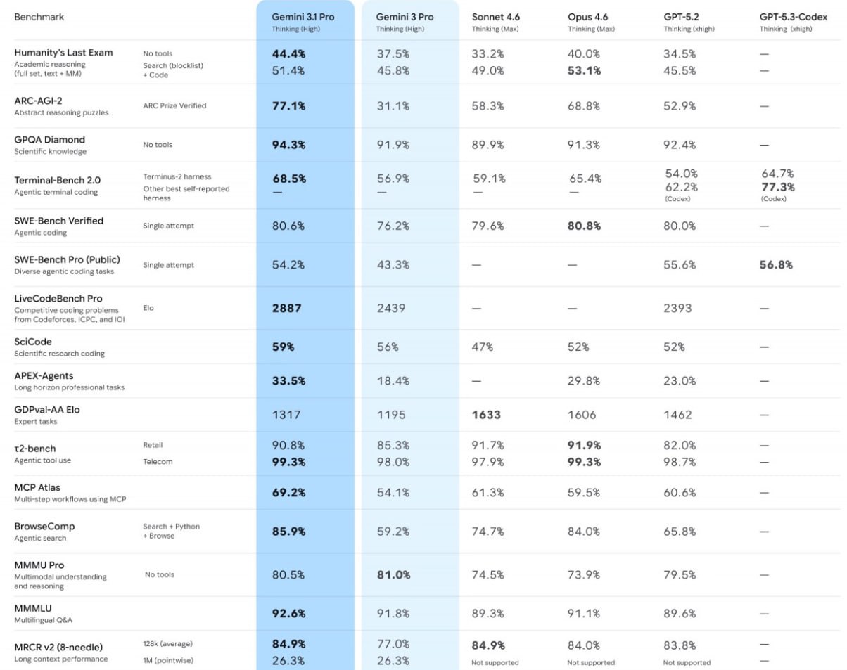▶️ По словам представителей Google, это отражается на результатах различных тестов искусственного интеллекта. На изображении ниже вы можете сравнить Gemini 3.1 Pro с другими новейшими моделями конкурентов Google, а также с Gemini 3 Pro.