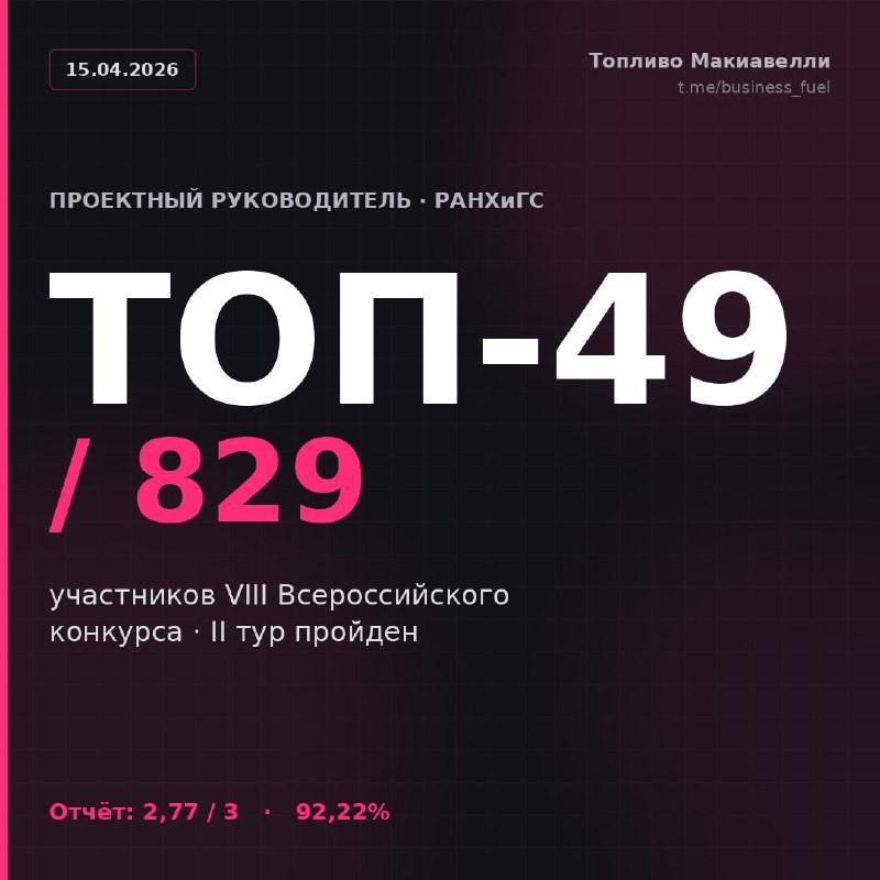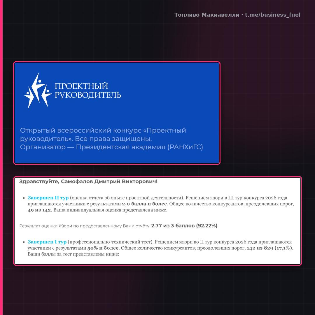 Подавался в этом году на «Проектного руководителя» от Президентской академии — это VIII всероссийский конкурс, в 2026 переформатированный: вместо привычных номинаций («руководитель проекта», «руководитель проектного офиса» и т.д.) — два профтрека.