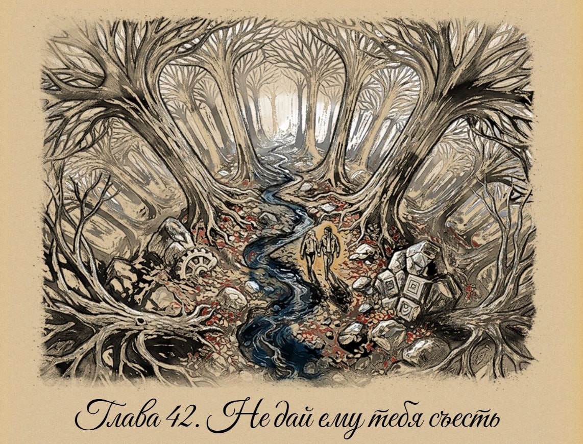 🌟 Новая глава в "Пути Укусая" Глава 42 - Не дай ему тебя съесть Затянувшийся голод в компании с холодом, пробирающим до дрожи, творили что-то странное сейчас с её восприятием. Она казалась себе лёгкой, как пёрышко, которое гонит вперёд ветер, и угнал бы давно на край света, если бы ноги не касались земли. А ручей, вдоль которого Байд её вёл, занимал в мыслях Мералли удивительно много места: слишком громкий, слишком мельтешащий перед глазами, слишком назойливый...