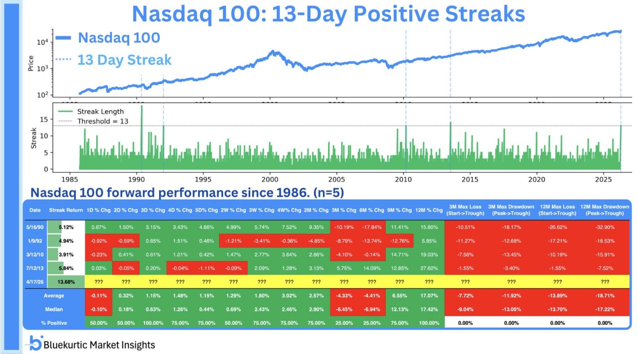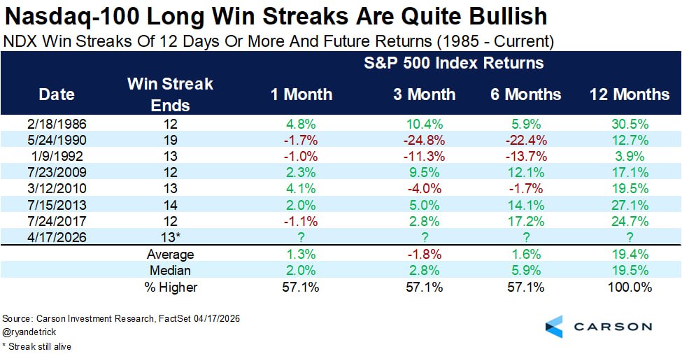 Во всех предыдущих четырёх случаях через 12 месяцев NASDAQ-100 показывал положительную доходность.