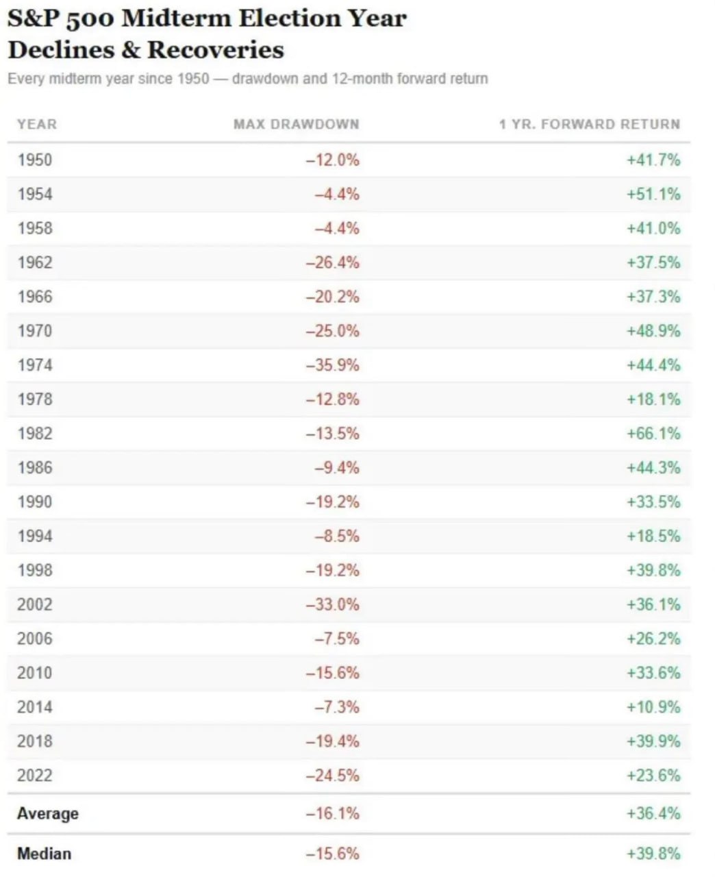 В таблице показано поведение S&P 500 в годы промежуточных выборов в США (midterm years) с 1950 года.