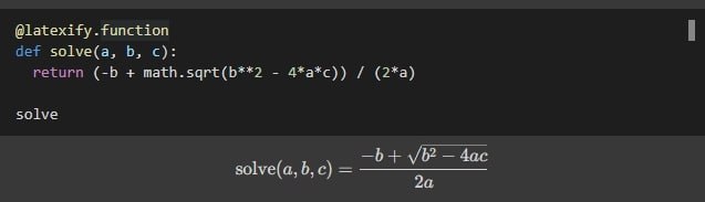 Пакет latexify делает ровно одну вещь: транслирует Python-функции в математические формулы LaTeX.