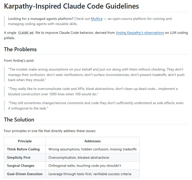 1️⃣ Think Before Coding Запрет на фантазии. Если LLM не уверена — она обязана остановиться и спросить. Никаких скрытых допущений и выбора формата "по умолчанию".