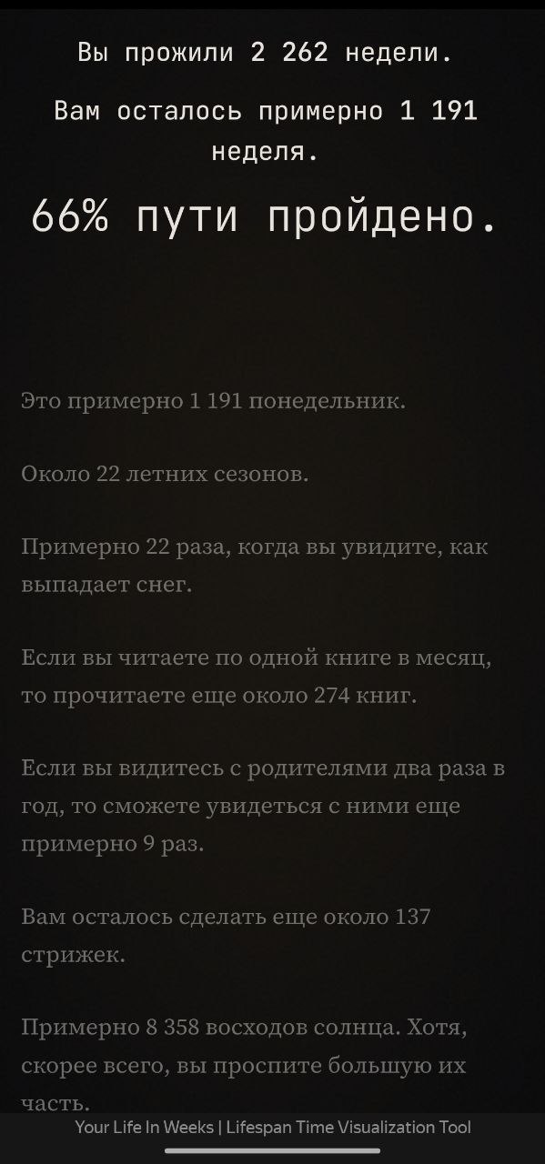 Для меня этот «мотивационный» сайт отмерил прожить еще 22 года или 1 191 неделю, т.е 65 лет — видимо как средняя продолжительность жизни мужчин в стране, хотя Kamalama давал на 10 лет больше.
