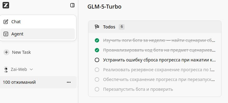 💪 Бот готов, тестируйте — 100 push-ups, и он все также работает на хостинге агента z.ai