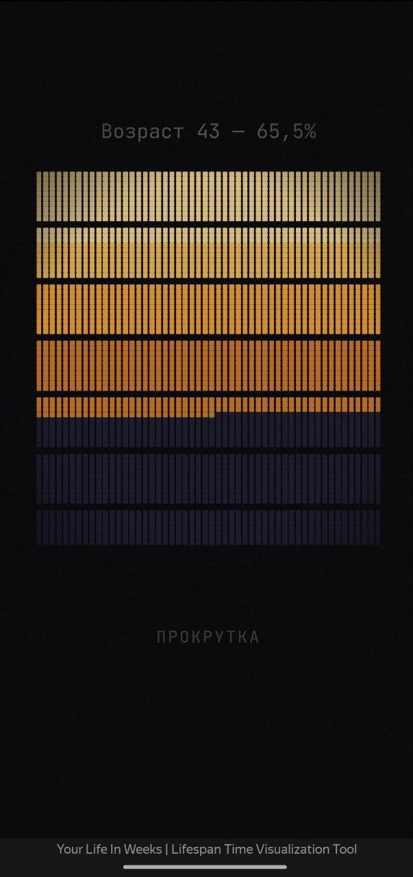 Каждый блок — одна неделя, цветные блоки — прожито, темные — осталось прожить. Для усиления эффекта, что «стакан наполовину пуст», вам показывают в натуральном выражении остаток вашей жизни — сколько осталось понедельников, сколько летних сезонов, стрижек и т.д.
