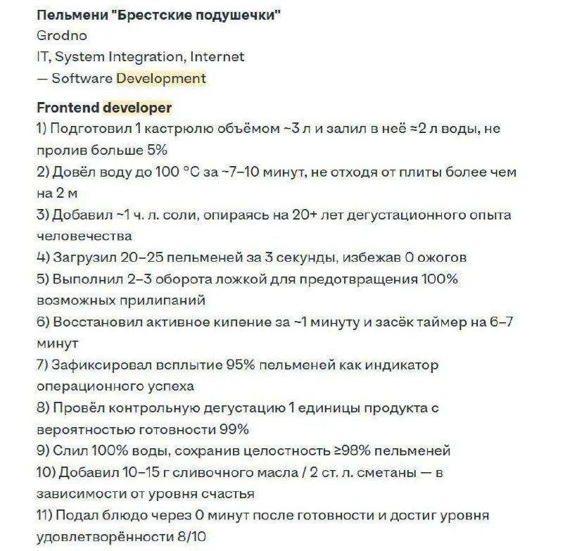 Айтишника пригласили на собеседование несмотря на то, что у него вместо резюме был рецепт приготовления пельменей. Он оптимизировал его под нейросетевые алгоритмы по ключевым словам, и ИИ-эйчар его принял. Настоящий HR даже не успел открыть резюме перед откликом. @banksta