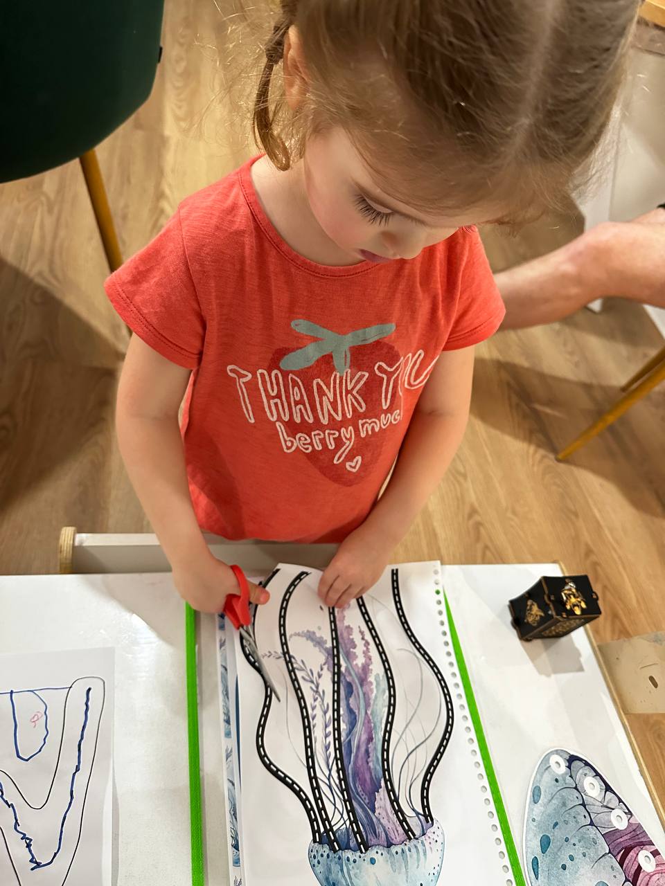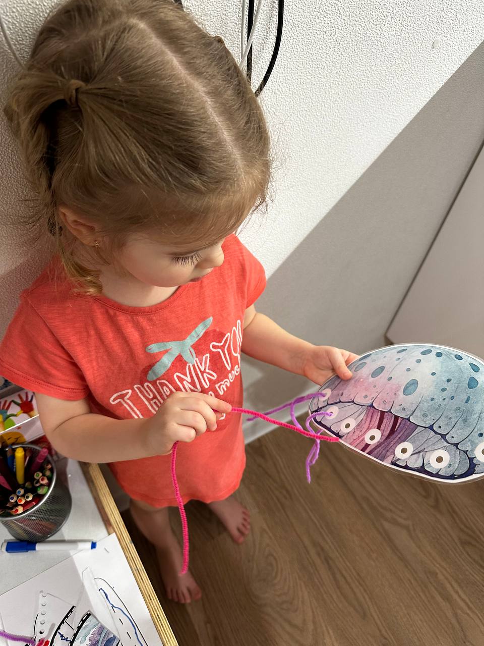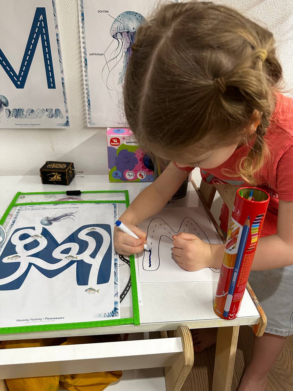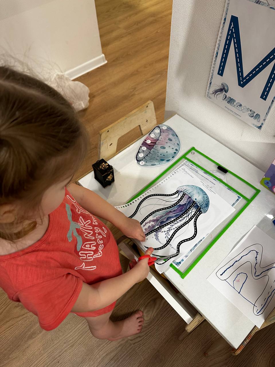 Буква «М» была преподнесена в связке с медузой. Изучили ее строение. Повспоминали, какие еще слова начинаются на букву «м». Провели пальчиком и нарисавовали фломастером саму букву. Отрезали медузе щупальца. А потом прицепили другие шупальца к зонтику.