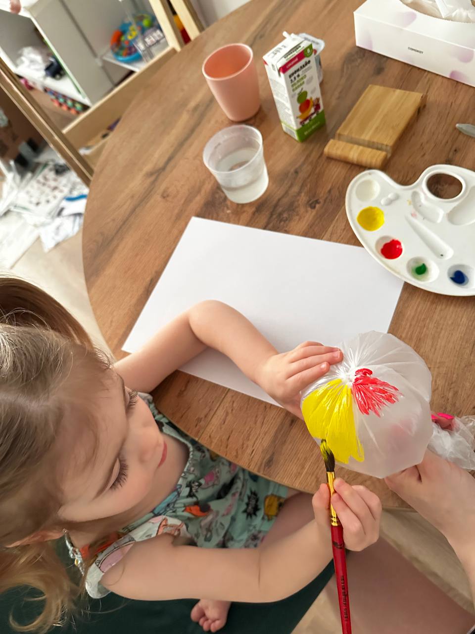 • рисование пакетом 😅. Покрасили пакет и делали отпечатки на листе.
