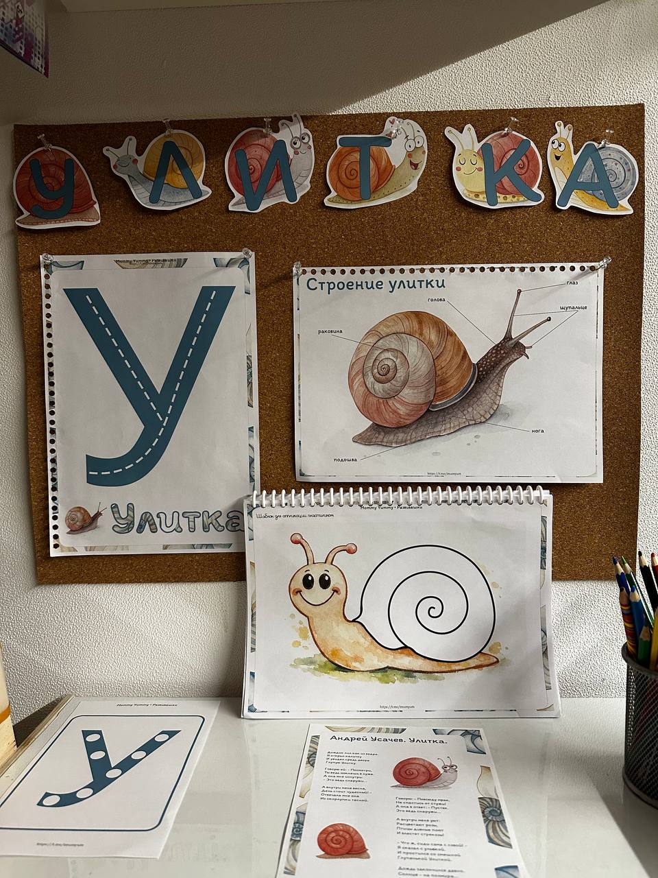 В программе: • познакомились со строением улитки (здесь настя мне небезосновательно заявляла, что там где у улитки глаза, это на самом деле «усики». Сложно было спорить) и узнали, как появляется потомство • разукрасили кружочки буквы У • пластилином и ракушками украсили раковину улитки • с папой они учили стишок Андрея Усачева (в процессе не участвовала, так что не знаю, что там у них получилось) • сделали аппликацию по образцу • распределили улиток по направлению движения