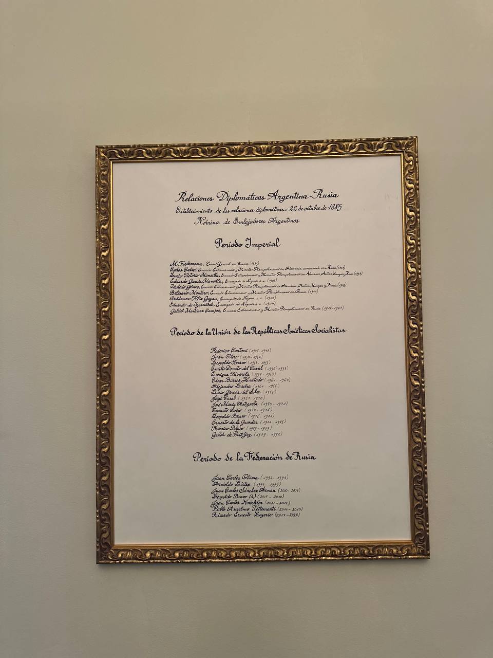 Дипотношения России и Аргентины начались в 1885 году и прерывались с 1921 по 1946, о чем намекает летопись послов, висящая на одной из стен. На остальных в основном виды Аргентины и гравюры, посвященные Монтевидео, столице соседнего Уругвая (хи-хи, как говорится).