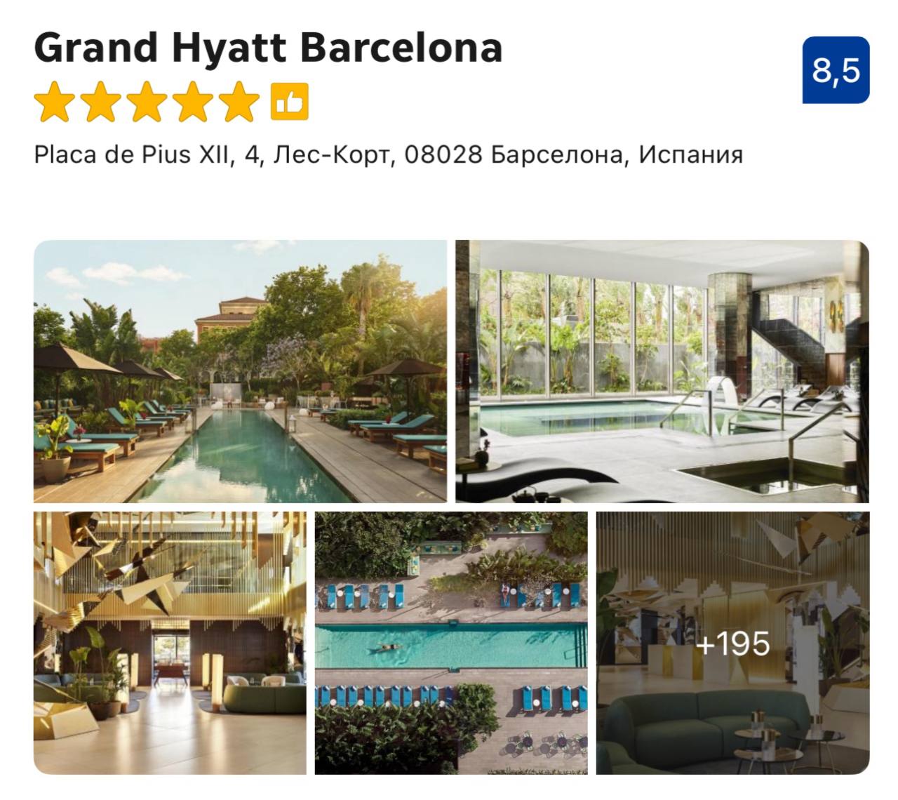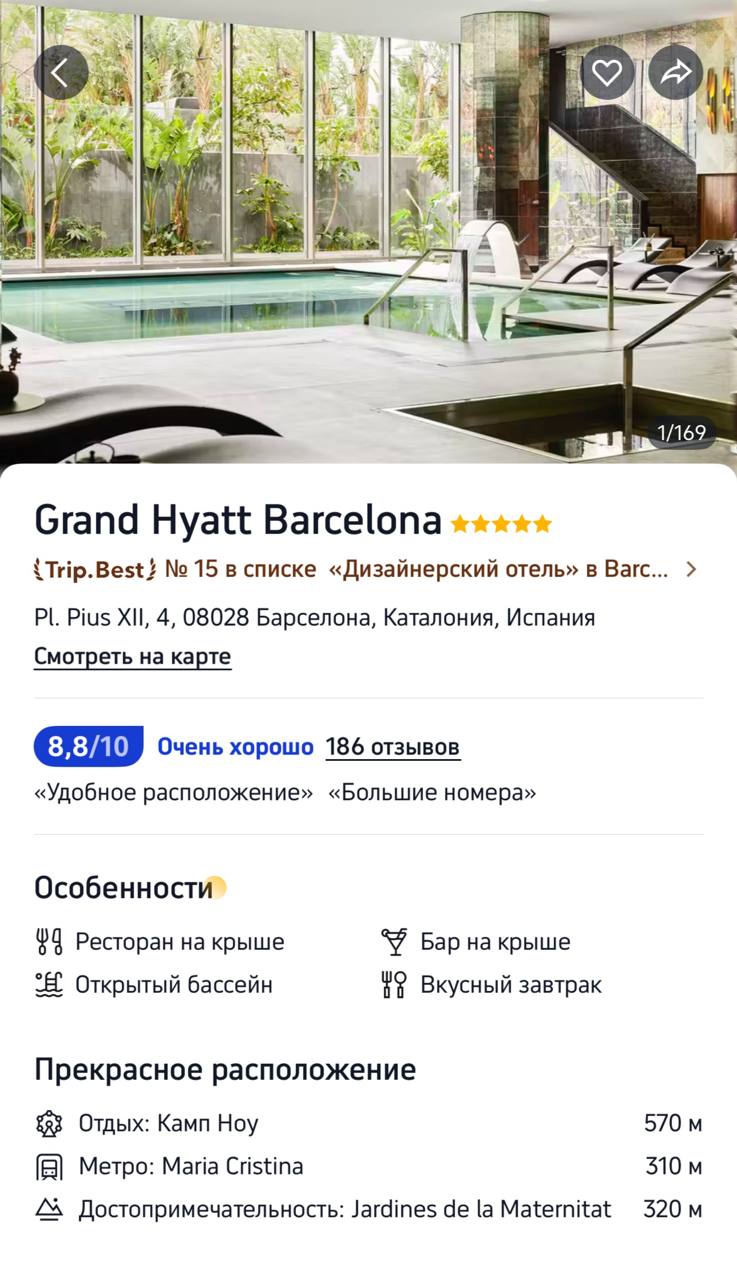 Рейтинг 8,8 на трипкоме и 8,5 на букинге, получается 15 000р за ночь в отличном, можно сказать лухари отеле, так ещё и в самый сезон. Да, отель не на берегу моря, но это излюбленный локалами район Les Corts, а футбольные фанаты оценят близость Ноу Камп (на реконструкции), спортивно-прогулочной инфраструктуры вокруг и сады.