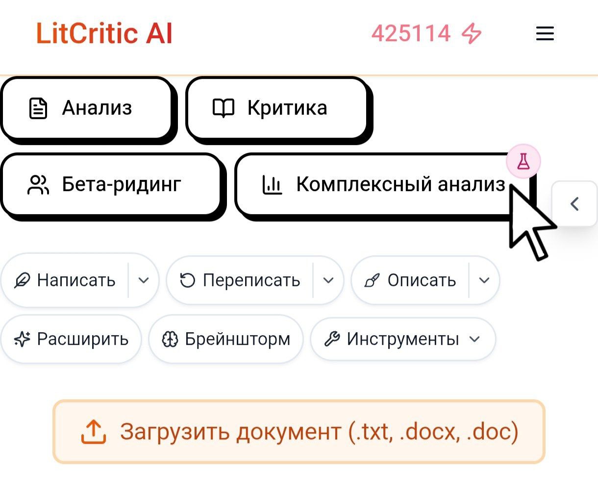 Функция «Комплексный анализ» на LitCritic— это самый глубокий инструмент платформы, который проводит мониторинг произведения сразу в трех плоскостях: от детальной проверки каждой главы до глобального анализа всей рукописи и проработки персонажей. Это не просто поиск ошибок, а системная оценка архитектуры вашего романа.