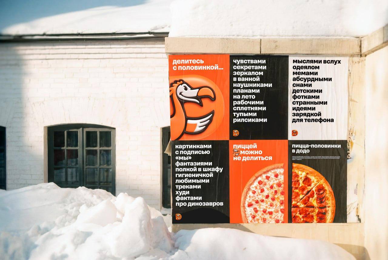 Кажется, Додо тоже об этом подумали и сделали новую наружку с очень понятным посылом. Постеры заметили у фотобудок, в подворотнях и даже рядом с ЗАГСами. И вся идея крутится вокруг простой мысли — можно делиться чем угодно, но не своей пиццей.