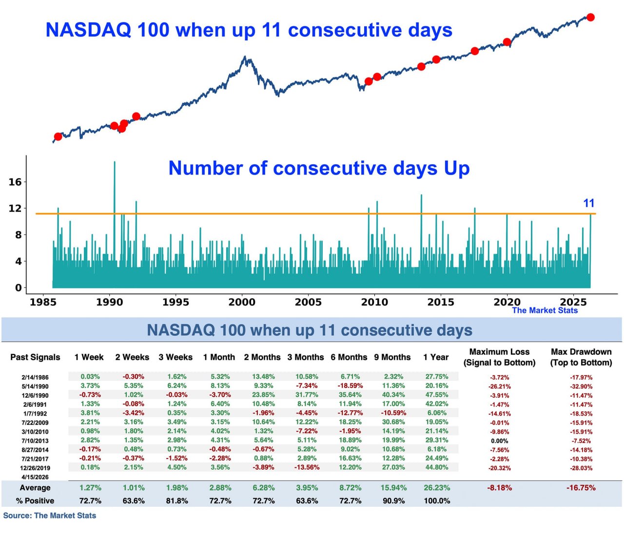 Импульс подобной силы исторически встречался крайне редко. По прошлым аналогичным сериям NDX через год оказывался выше в 100% случаев, а средняя доходность составляла около 26%.