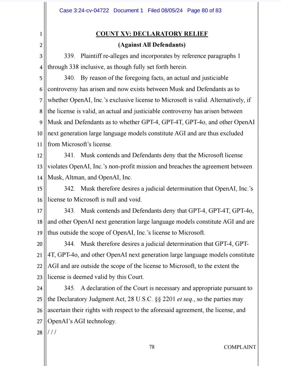 В частности, если суд вдруг признает этот факт, лицензионное соглашение OpenAI с Microsoft потеряет силу (оно работает только для pre-AGI, но не для AGI-технологий), а учредительное соглашение OpenAI потребует сделать их модели открытыми и свободно доступными.