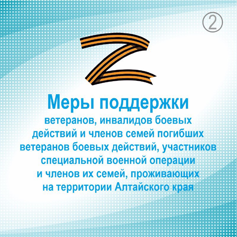 Меры для ветеранов, инвалидов боевых действий и членов семей погибших ветеранов боевых действий, а также для участников специальной военной операции и членов их семей, которые живут в Алтайском крае. Подробнее смотрите в карточках.