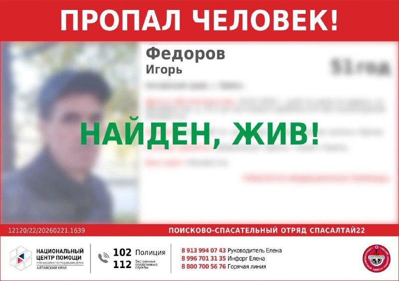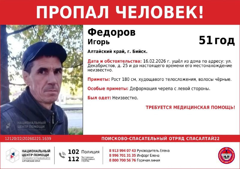Алтайский край, Бийск. Пропал Федоров Игорь, 51 год. 16.02.2026 он ушел из дома по адресу ул. Декабристов, 25. С тех пор местонахождение неизвестно. Горячая линия: 89139940743 (Елена), 89967013135 (инфорг Елена). Людям, владеющим…