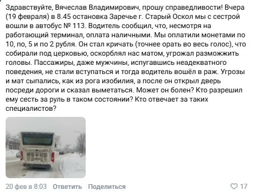 Утром 19 февраля в Старом Осколе на маршруте № 113 водитель выгнал из автобуса двух пассажирок после оплаты мелочью и, по словам очевидцев, угрожал им.