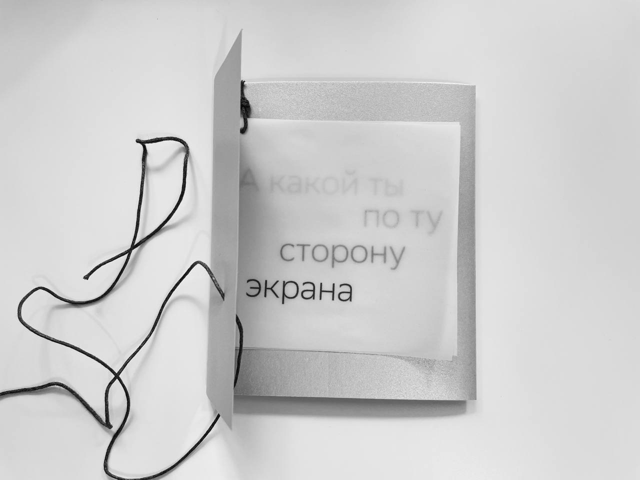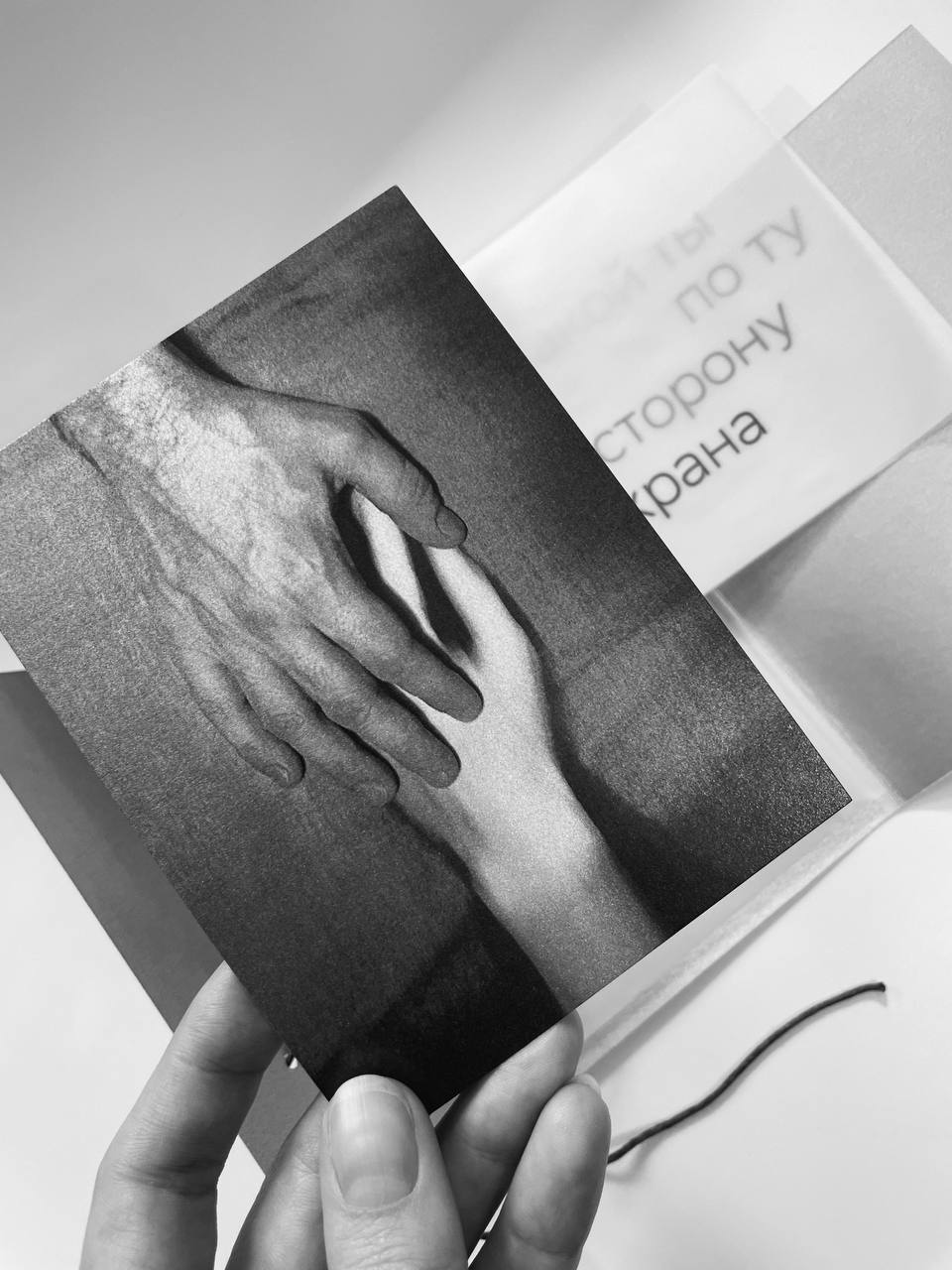 Фотопроект выполнен в виде колоды ассоциативных карт: зритель выбирает визуально откликнувшуюся карту, а на обороте — ответ на вопрос «А какой ты по ту сторону экрана?», создавая эффект игры и интерактивного вовлечения. Карты не дают прямого ответа, а оставляют зрителю пространство для интерпретации, чтобы он мог соотнести увиденное с собственным опытом. «А какой ты — по ту сторону экрана?»