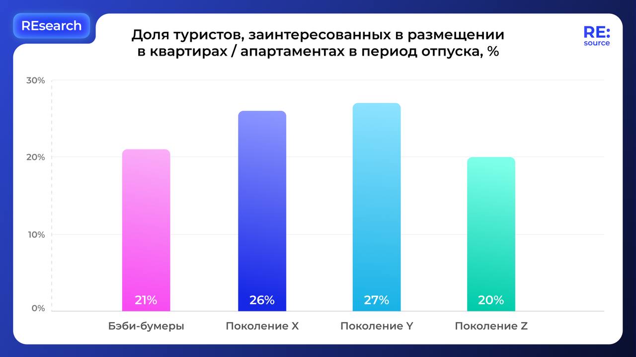 Больше четверти туристов из поколений X и Y предпочитают жить в апартаментах на период отпуска — 26% и 27% соответственно. Среди них много семей с детьми, поэтому размещение в съемных квартирах помогает сэкономить деньги на питании.