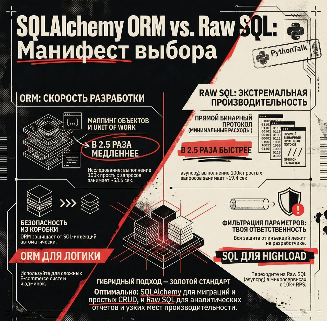3. Raw SQL (asyncpg) — для узких мест: аналитические отчеты, массовые инсерты и микросервисы с нагрузкой 10k+ RPS.