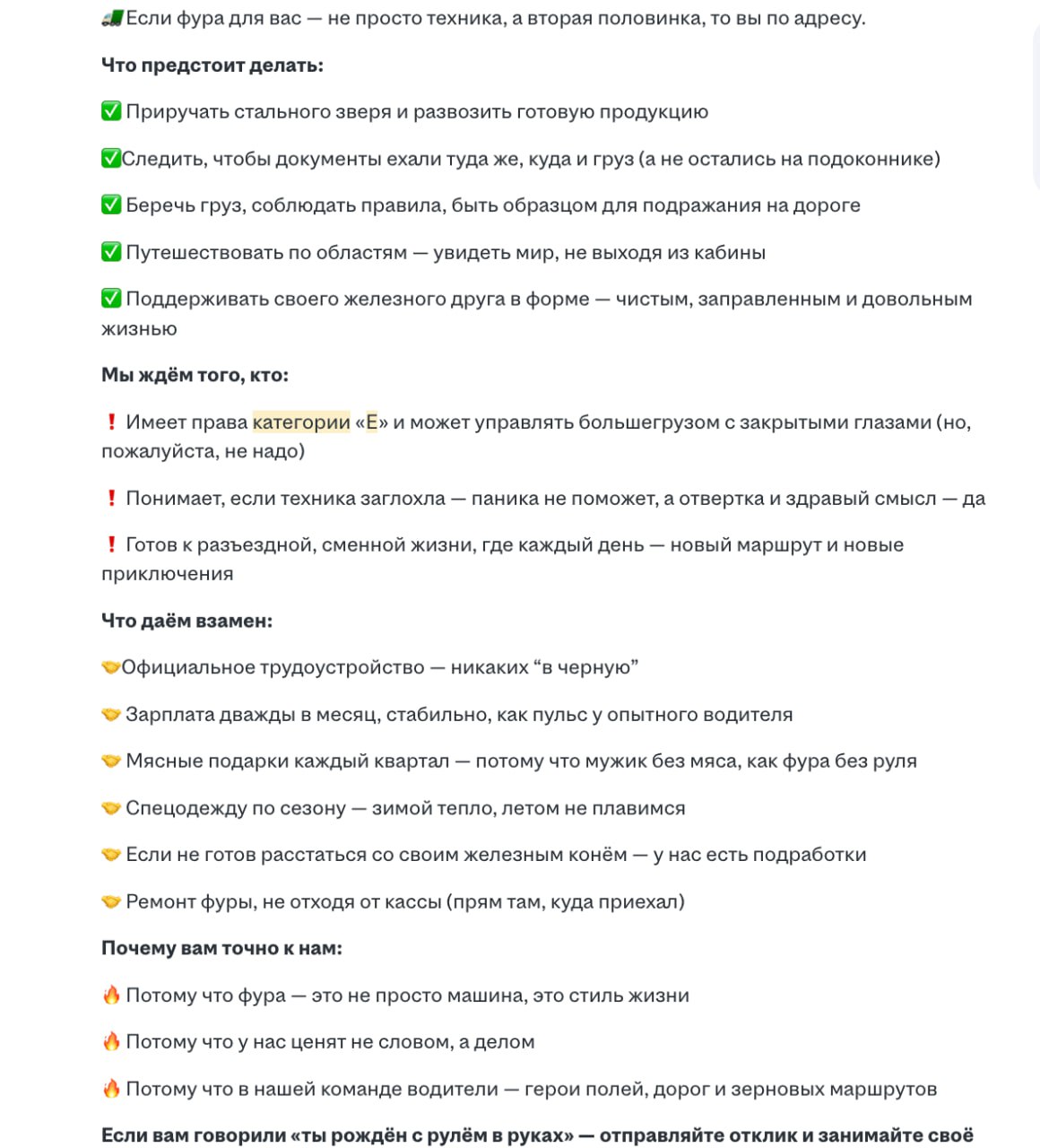 В объявлении будущего сотрудника называют «властелином дорог» и приглашают тех, для кого фура — «не просто техника, а вторая половинка».