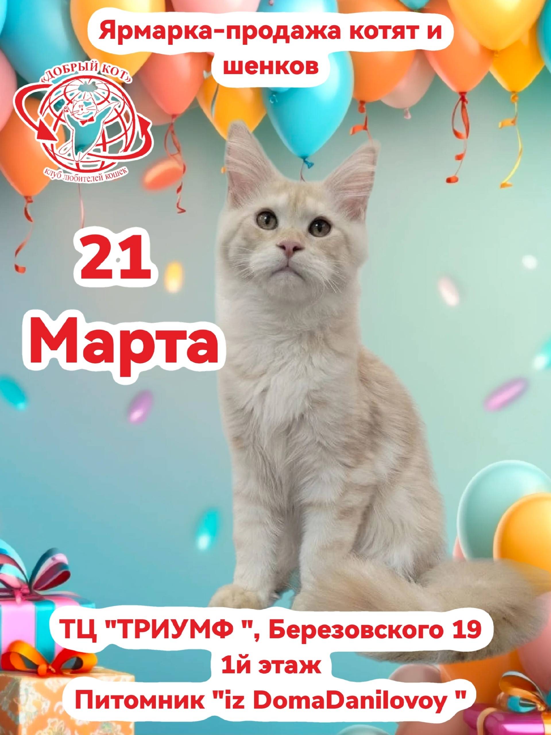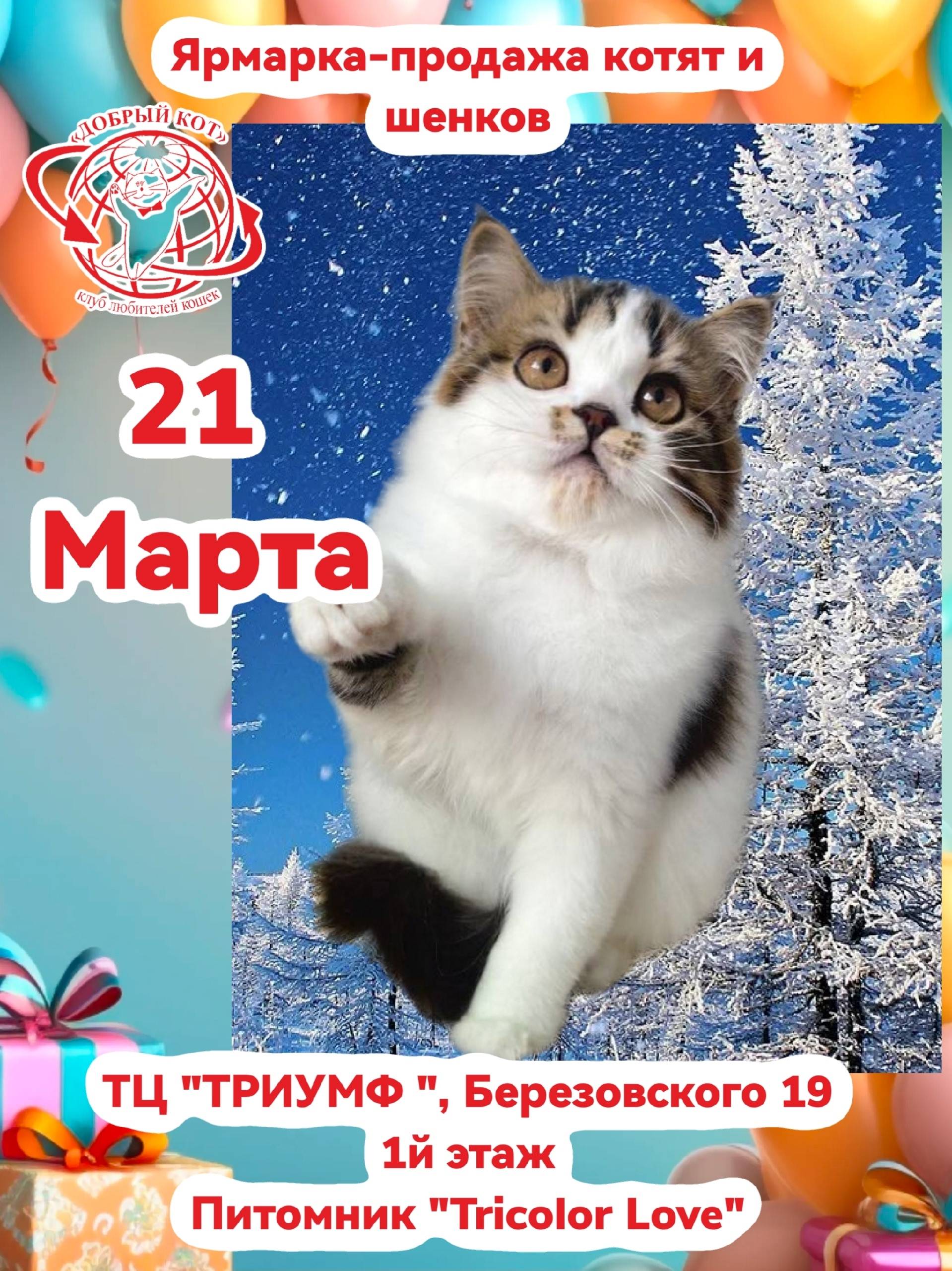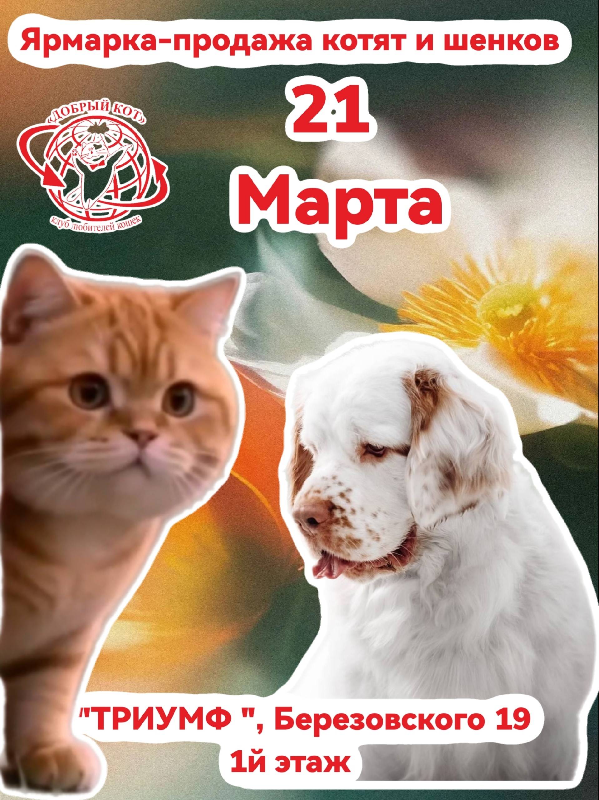 21 марта, куда пойти? Конечно же, мы ждём вас на ярмарке-продаже котят и щенков, где вы можете пообщаться и получить исчеппывающую информацию от заводчиков. Это хороший момент стать владельцем породного котёнка или щенка. Мы находимся в ТЦ Триумф, по адресу - Омск, ул Березовского 19, 1й этаж, рядом с Зоомаркетом 4 лапы. бэби-салон Вход свободный с 10 до 19-00.