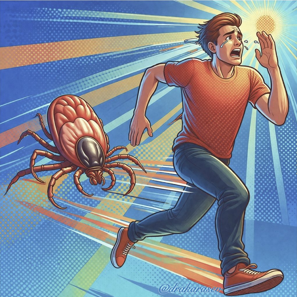 Факты о клеще Гиаломма: • К нашим клещевым энцефалиту и боррелиозу добавляеются носительство и вероятность заболеть: • Рикетсиоз (Rickettsia aeschlimannii) • Лихорадка Крым-Конго (CCHF) со смертностью 10–40% (узнали по сообщениям из Франции с 2022г) • Агрессивный: Сам ищет хозяина, бегает со скоростью муравья, кусает днём, личинки/нимфы путешествуют на птицах. • Любит степи, кусты, сухость. • 3 стадии: личинка/нимфа/взрослый — все кусают.