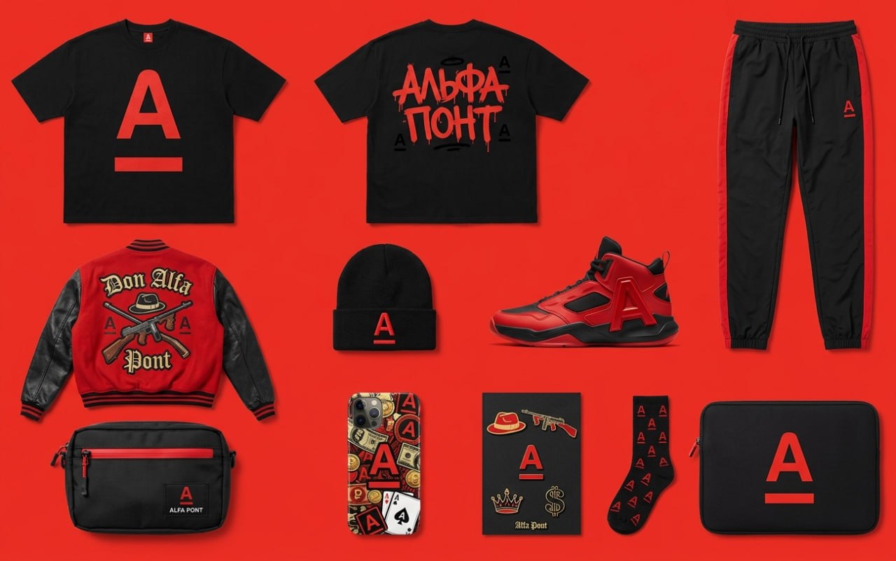 Надписи на майках: - Деньги любят тишину - Понт - это когда платёж прошёл - Не богатый, а расчётливый - карта в стиле «мафиозной» визитки - кошелёк «АльфаПонт» - стикеры в стиль