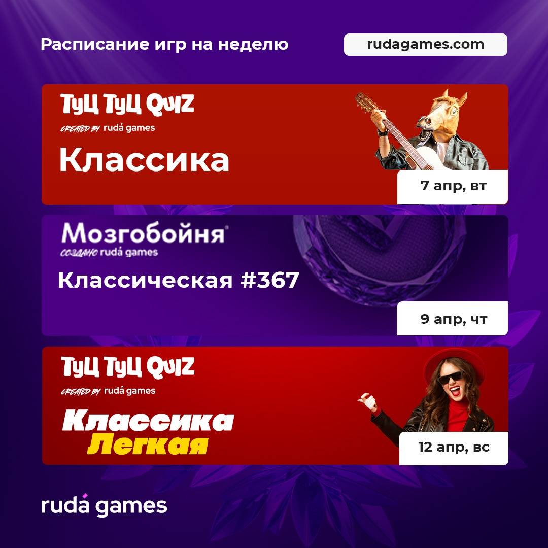 ● 7 апреля, вторник, 19.00 - Классический Туц Туц Квиз 🕺Вас ждёт от 100 классных песен всех жанров и времён, потому что Туц Туц QUIZ - музыкальный квиз без текстовых вопросов на логику. Вас ждёт куча новых треков и механик. Только любимые песни, знакомые клипы и желание петь. 500 р./игрок.