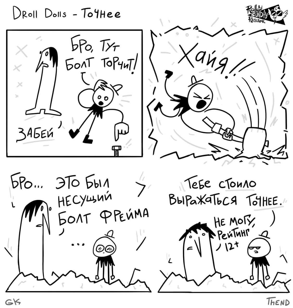 🔥 "Droll Dolls" от Gee Kay Гена решил побиться головой о стену: подняв взор, он понял, что хаотичные следы внезапно сложились в комикс - Droll Dolls. 🌀 ВК иАК