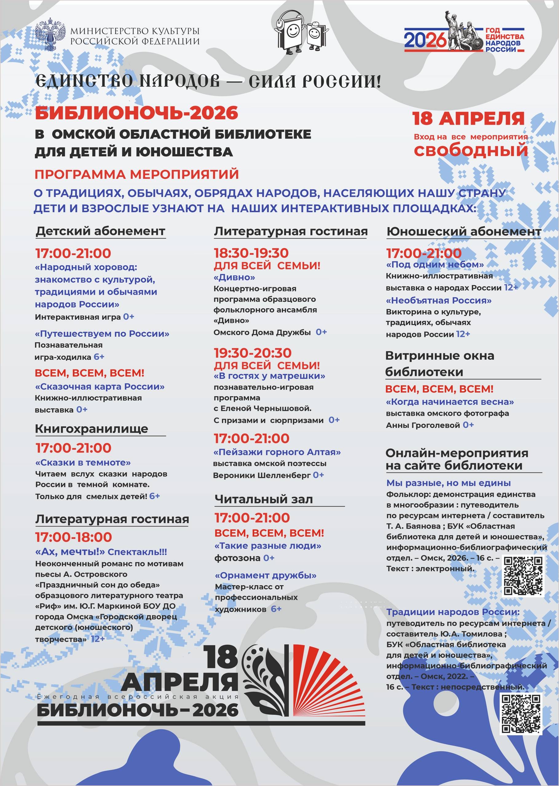 Ежегодная акция «Библионочь» в 2026 году пройдет в России уже в 15-й раз. Тема акции в этом году — «Единство народов — сила России!». Организаторы акции «Библионочь» — Министерство культуры Российской Федерации, Российская государственная библиотека и портал культурного наследия и традиций России «Культура.РФ».