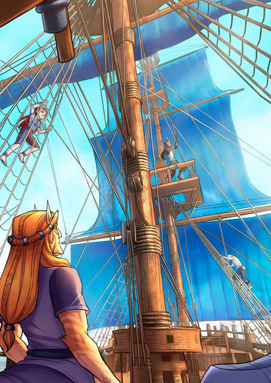 ⚓ Вид на мачту глазами Теофора. Хотелось, чтобы читатель вместе с героем изучал корабль и его команду. ТАк же это была первая попытка обрисовать 3д фон под стиль персонажей.