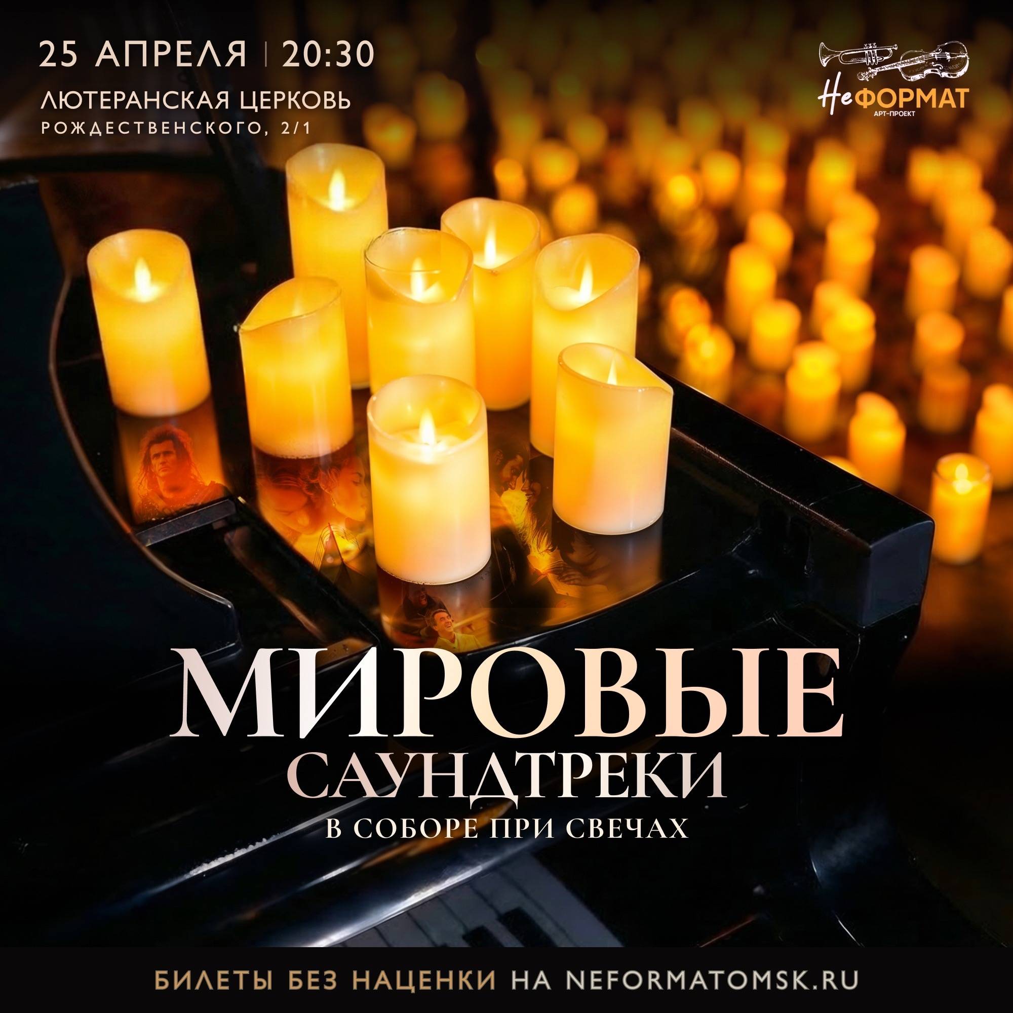 Концерт саундтреков из фильмов в атмосфере сотен свечей с участием музыкантов. Программа включает композиции из "Интерстеллар", "Титаник", "Телохранитель" и других.