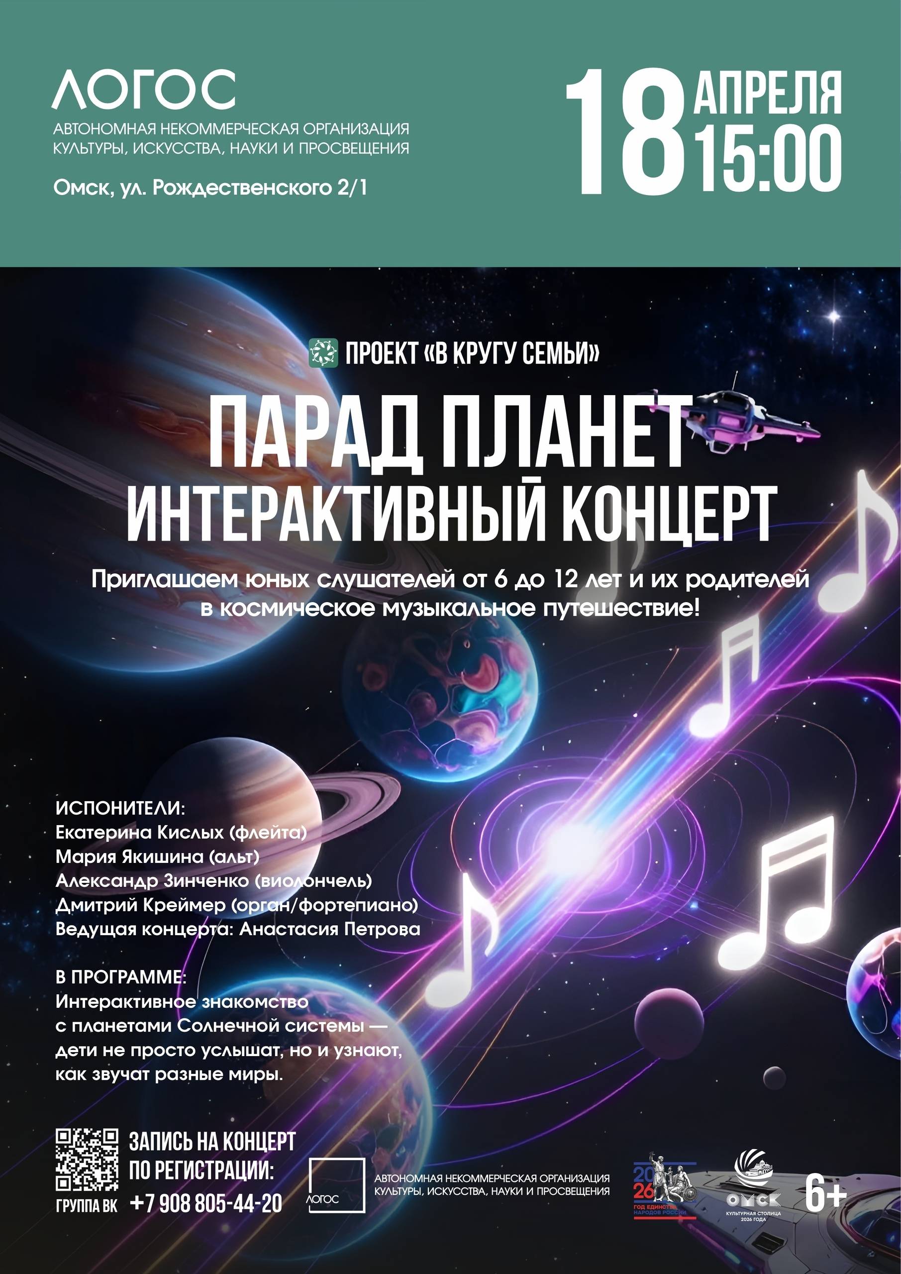 Музыкальное космическое путешествие для детей от 6 до 12 лет и их родителей с живой классической и популярной музыкой, интерактивным знакомством с планетами Солнечной системы и увлекательным рассказом о космосе.