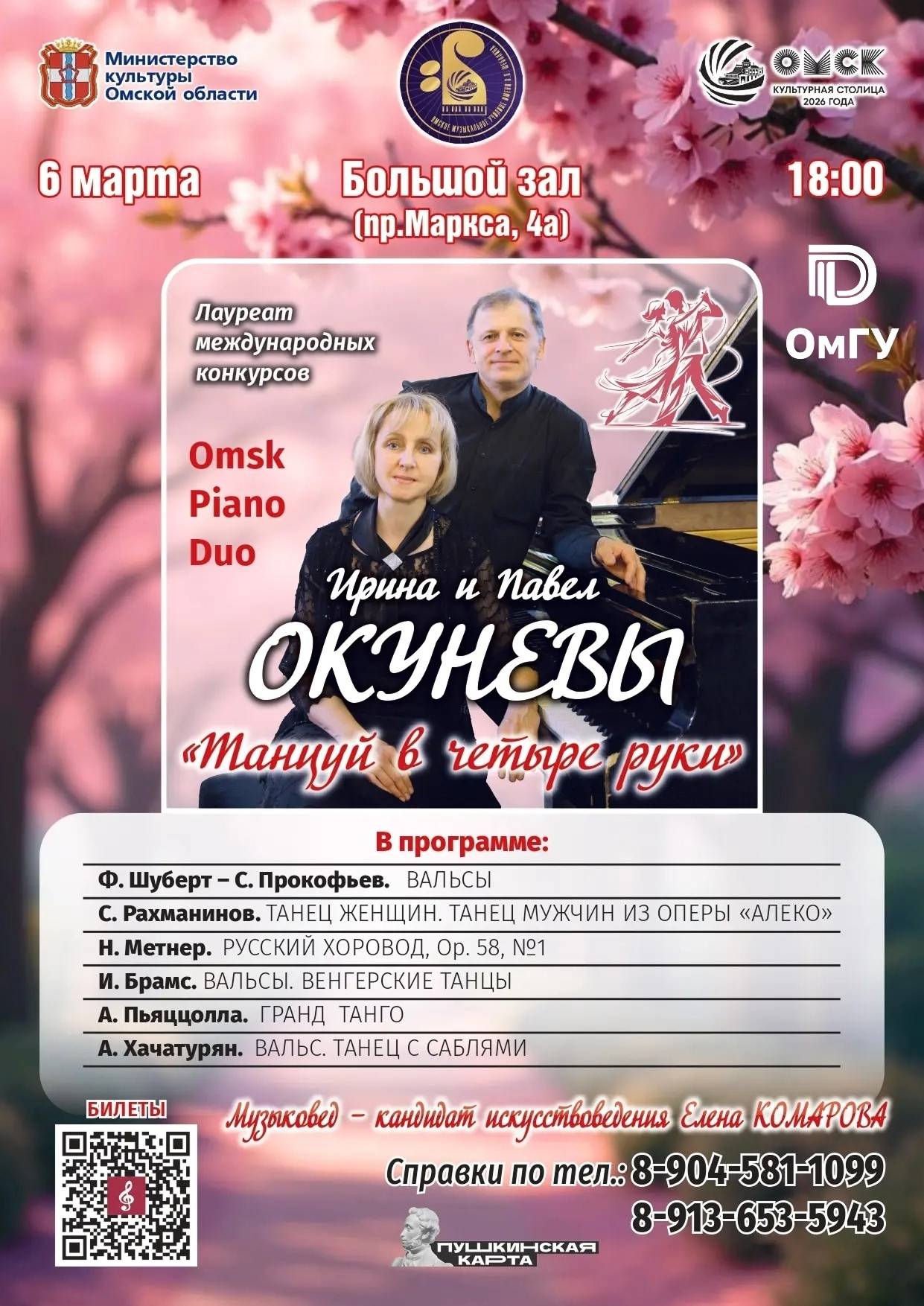 Фортепианный дуэт Omsk Piano Duo (Ирина и Павел Окуневы) представляет весенний концерт. В программе произведения Шуберта, Прокофьева, Рахманинова, Метнера, Брамса, Пьяццоллы и Хачатуряна. Музыковед - Елена Комарова.