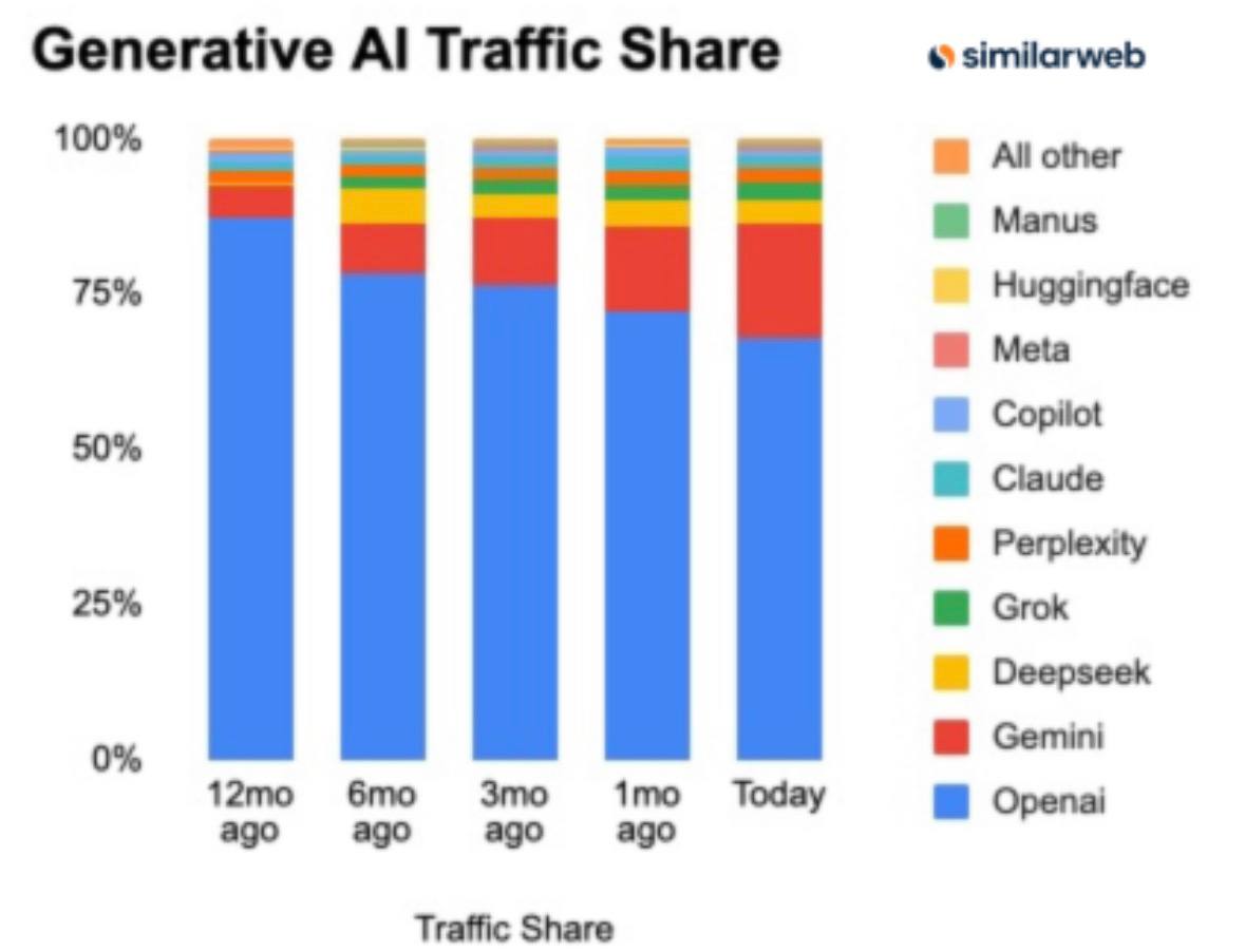 Главный конкурент Gemini за год вырос с 5,4% до 18,2%. Главное оружие Google — это собственная экосистема: AI выдача в поисковике, Ассистент Gemini по умолчанию в Android. 76% всего траффика приходится на домен google.com.