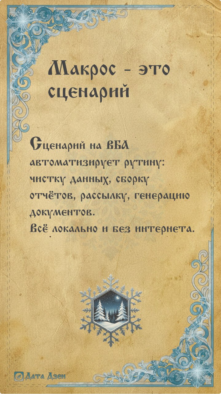 Макрос - сценарий на VBA, который автоматизирует рутину: чистку данных, сборку отчётов, рассылку, генерацию документов. Всё локально. Без интернета.