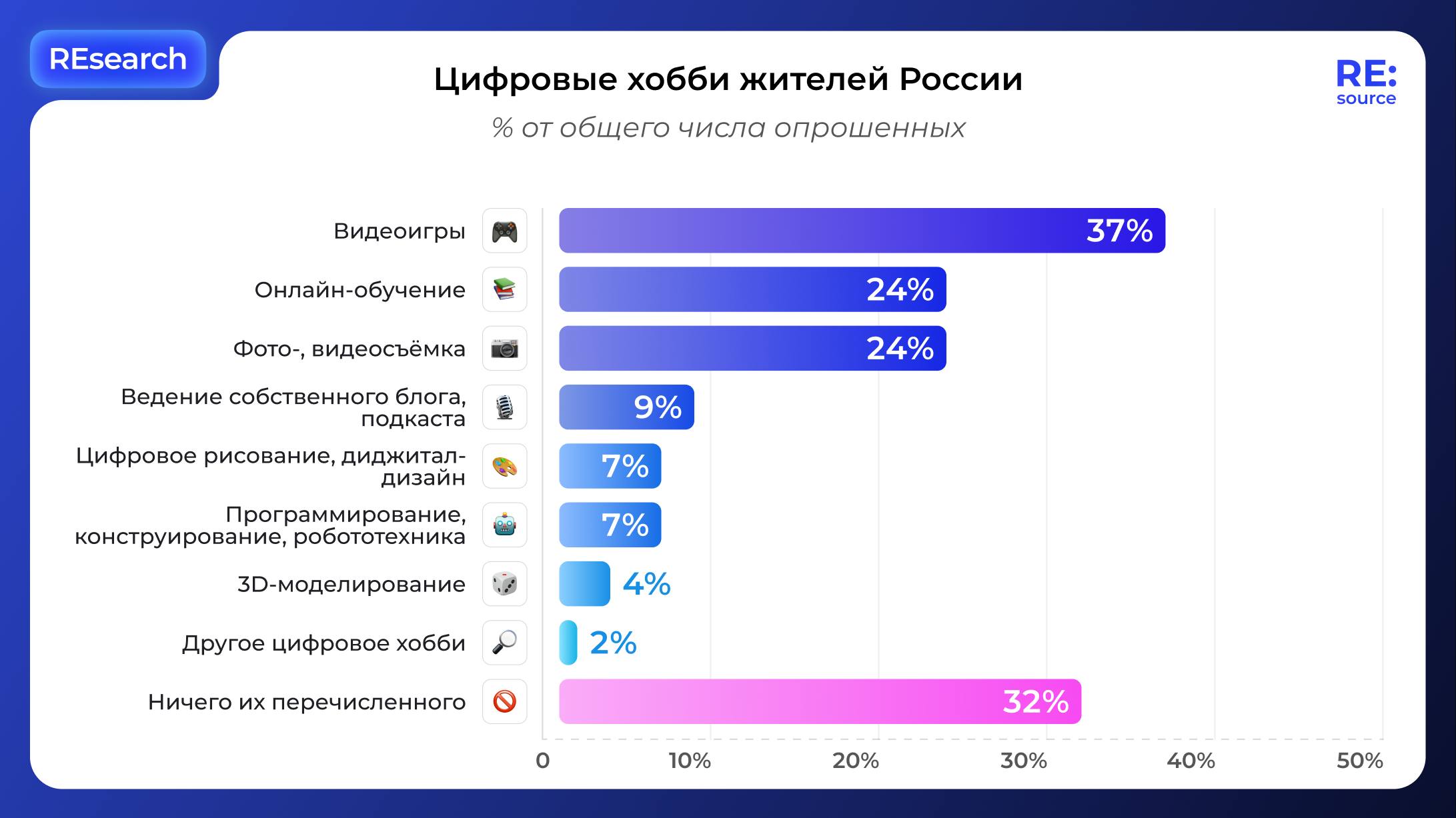Самым популярным хобби стали видеоигры — в них в свободное время любят играть 37% россиян. Онлайн-обучение и фото-/видеосъемка пользуются равной популярностью — по 24% соответственно.